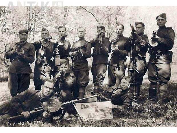 Да фактически они воевать нормальным офицерам и солдатам мешают! В результате просмотра подобных фильмов у подрастающего поколения, которое книг не читает (особенно научного характера), складывается ощущение, что народ (армия) победил вопреки высшему руководству страны и «карательным» органам. Глядишь, если бы под ногами не путались представители НКВД и СМЕРШа, могли и раньше победить. К тому же «кровавые чекисты» в 1937-1939 гг. уничтожили «цвет армии» во главе с Тухачевским. Чекиста хлебом не корми — дай кого-нибудь расстрелять под надуманным предлогом. При этом, как правило, стандартный особист - это садист, полный мерзавец, пьяница, трус и т. п. Ещё один любимый ход кинематографистов – это показать чекиста в контрасте. Для этого в фильме вводится образ доблестно сражающегося командира (бойца), которому всячески мешает представитель НКВД. Часто этот герой из числа ранее осужденных офицеров, или даже «политических». Трудно представить подобное отношение к танкистам или лётчикам. Хотя бойцы и командиры НКВД, военной контрразведки – это военное ремесло, без которого не обходится ни одна армия мира. Очевидно, что соотношение «мерзавцев» и обычных, нормальных людей у этих структур, как минимум не меньшее, чем в танковых, пехотных, артиллерийских и др. частях. А возможно, что и даже лучшее, т. к. ведётся более строгий отбор.Коллективный снимок действующих бойцов-диверсантов 88-го истребительного батальона УНКВД города Москвы и Московской области — спецшколы подрывников УНКВД города Москвы и Московской области. Осенью 1943 года все они были переведены в состав спецроты Управления войск НКВД по охране тыла Западного фронта, а 6 марта 1944 года большинство из них пополнили собой ряды секретных сотрудников Разведывательного отдела штаба Западного (с 24 апреля 1944 года – 3-го Белорусского) фронта. Многие не вернулись из зафронтовой командировки в Восточную Пруссию.