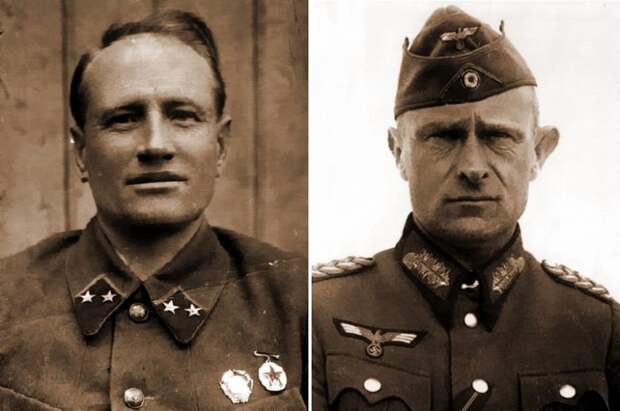 Победитель и побеждённый: младший лейтенант Георгий Сергеевич Ротов (фото из архива ЦАМО, сделанное после увольнения из армии) и бригадный генерал Ромулус Димитриу (кадр кинохроники)