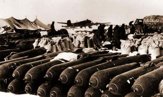 На переднем плане штабели «сигар» контейнеров, с помощью которых снабжалась окружённая группировка в конце своего существования. На заднем плане четырёхмоторный Fw 200 «Кондор»