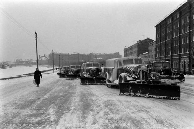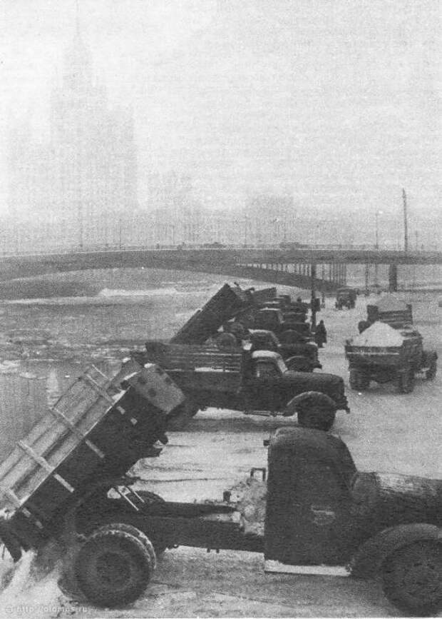Обычно 400 самосвалов с утра до вечера вывозят снег. В те же дни, когда, выражаясь языком института прогнозов, осадки бывают особенно обильными, на улицы столицы выходит более 1000 машин. Сотни тонн снега ежедневно сбрасываются в Москву-реку и Яузу, в тех местах, где реки не замерзают. "Если сбрасывать на лёд,- говорят работники Треста,- то за несколько дней горы снега достигнут самых перил набережной".