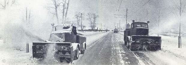 По обочинам Хорошёвского шоссе идут две снегоуборочные машины - роторы. Винты , вращающиеся в разных направлениях, загребают снег, а лопасти вентилятора выбрасывают его струями на 40 - 50 метров в сторону. (Из текста статьи Т. Лордкипанидзе "Снег идёт...).