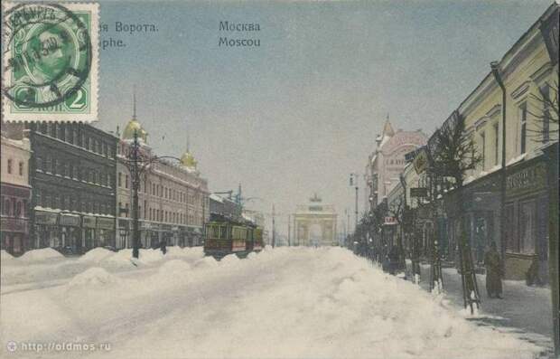 Большая Тверская-Ямская. 1912 год. Впереди видна Триумфальная арка, которая раньше стояла на площади Белоруского вокзала.