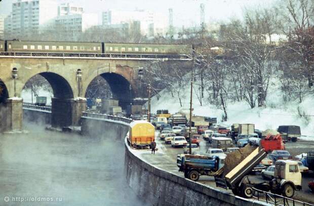 Снимок 12.1994. Андроньевская наб. мост Курской ж/д. Самосвалы сбрасывают снег прямо в Яузу, безобразники, редиски.