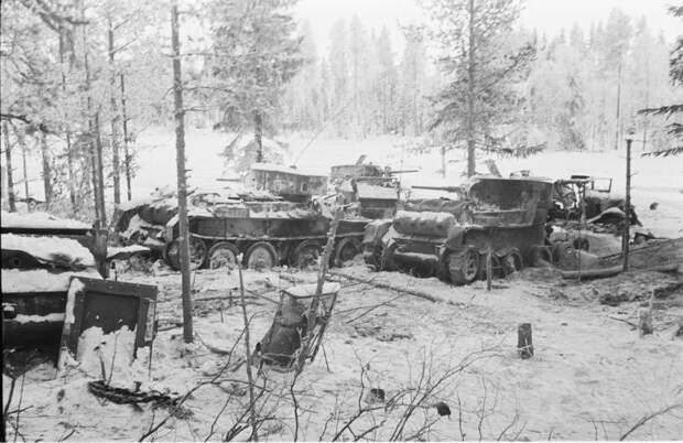 Советские танки БТ-5, попавшие в окружение и уничтоженные финскими войсками. На заднем плане — разбитый грузовик ГАЗ-АА