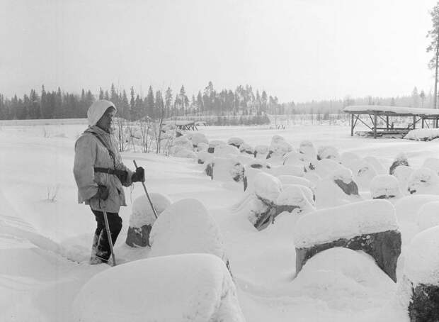 Финский офицер-лыжник у линии надолбов во время битвы при Колле. Боевые действия проходили в Ладожской Карелии, у горы Колла и реки Колласйоки. Этот вид заграждений был признан финнами относительно неудачным, за надолбами укрывались советские пехотинцы, а танки разрушали заграждения бронебойными снарядами