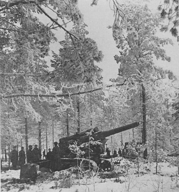Советская 203-мм гаубица Б-4 на огневой позиции на Карельском перешейке. Февраль 1940 г.
